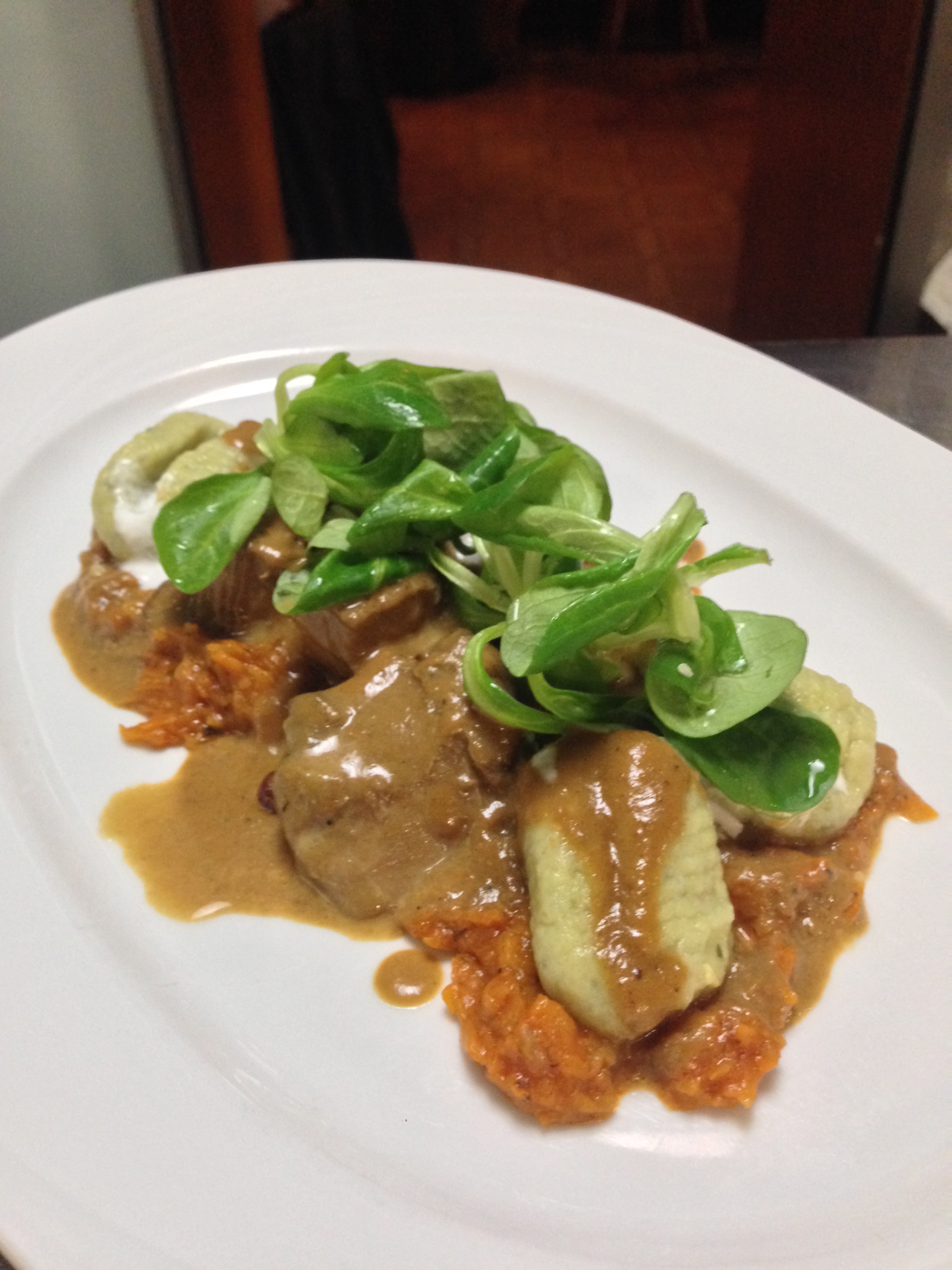 In Wacholder und Lorbeere gebeizt, mit Rotwein vom Gerhard und Wurzelwerk geröstet wird das Wildtier auf langsamer Flamme im Sud gezogen.
