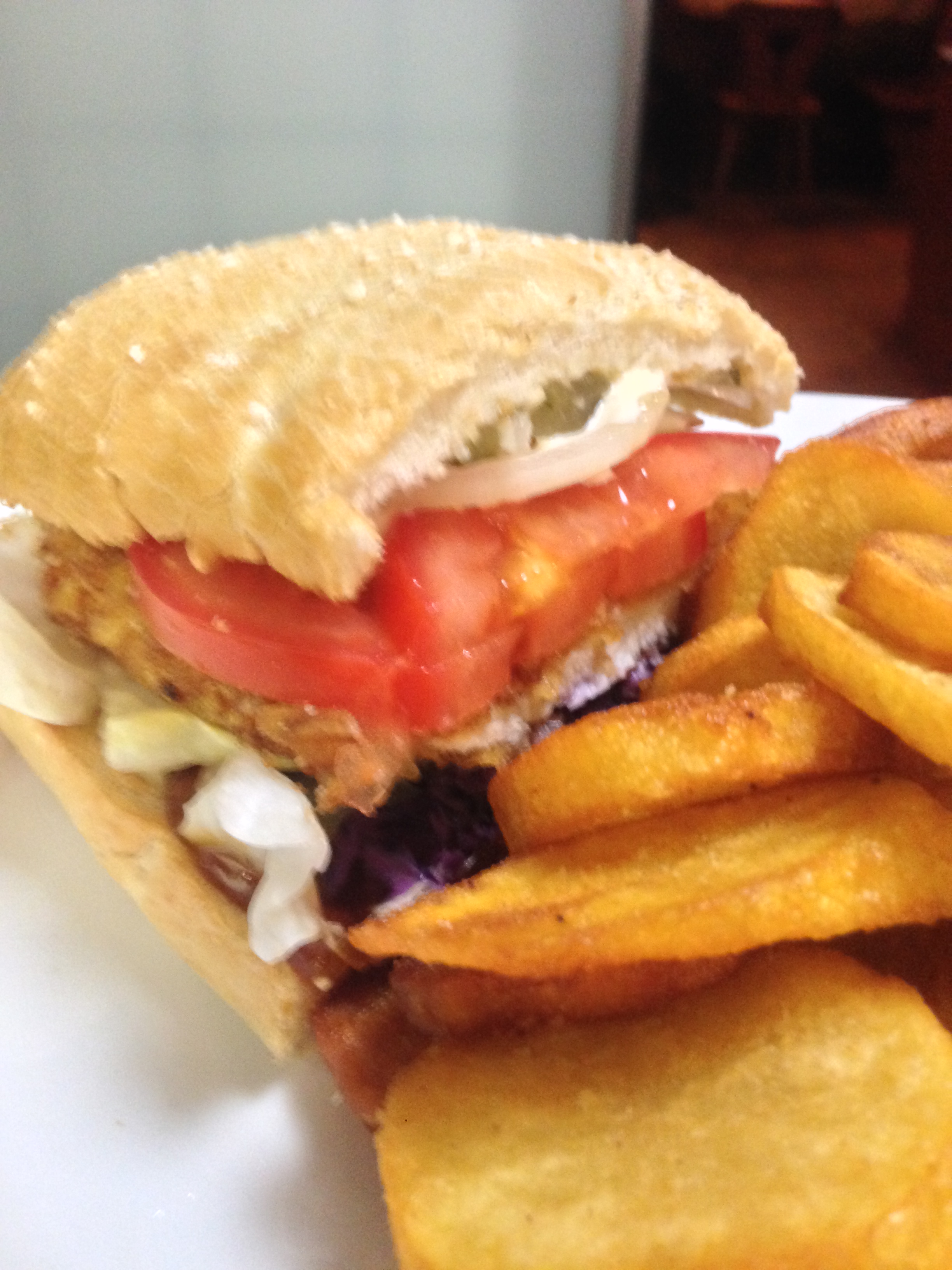 Knuspriges Hühnerfleisch im Weizenmehlbrötchen mit Barbecuesauce, Golddukaten und rahmigen Krautsalat