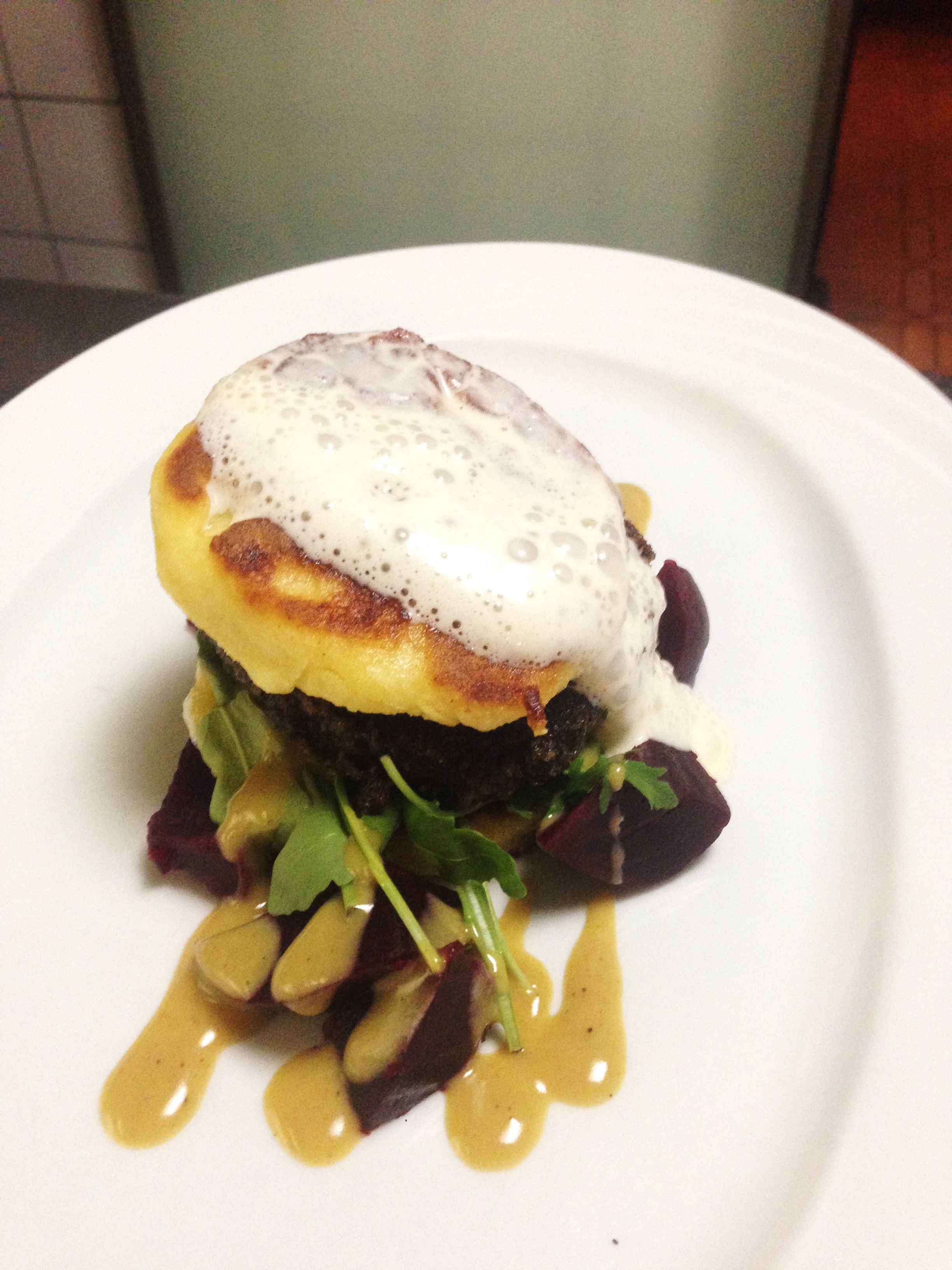Wir möchten nicht den Anschein erwecken, die Gerichte zu fastfoodisieren, auch wenn wir die Bezeichnungen gerne dazu kopieren. Diese Präsentation ähnelt in ihrer Erscheinung lediglich einem Burger, nur werden wir zur Gänze auf das schwammige Weißbrotweckerl verzichten.