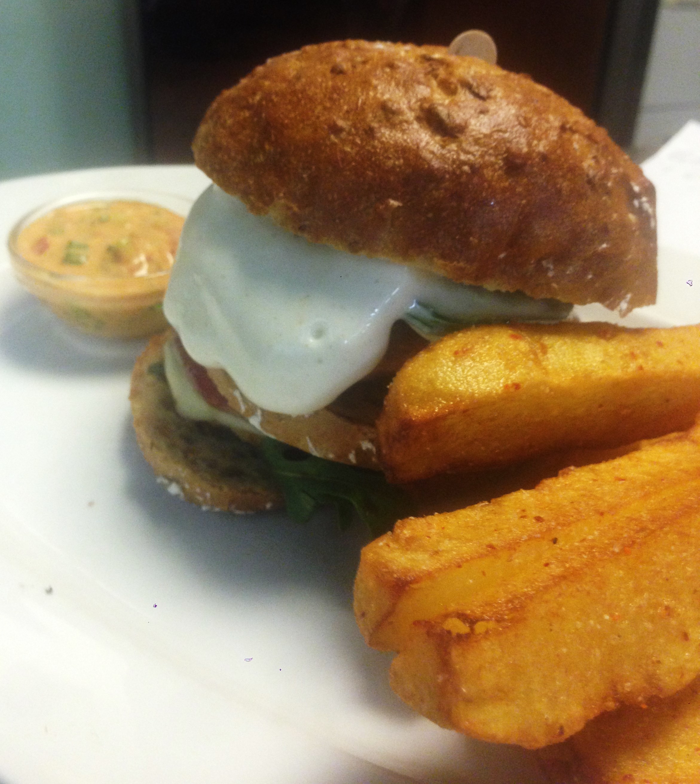 Zwei faschierte Fleischlagen mit Käseschaum auf geschmorter Zwiebel mit knackigem Rucola gefüllt im Roggenweckerl versprechen die Notwendigkeit – beim Anbiss – das Unterkiefer ausrenken zu müssen.